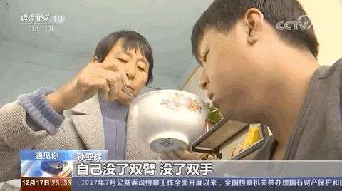 孙亚辉没有双臂,无法像正常人那样用手滚动鼠标,更无法打字。他试着用左臂仅存的一段残肢来点按鼠标,用牙齿咬着筷子,靠舌头操纵方向去敲击键盘。
