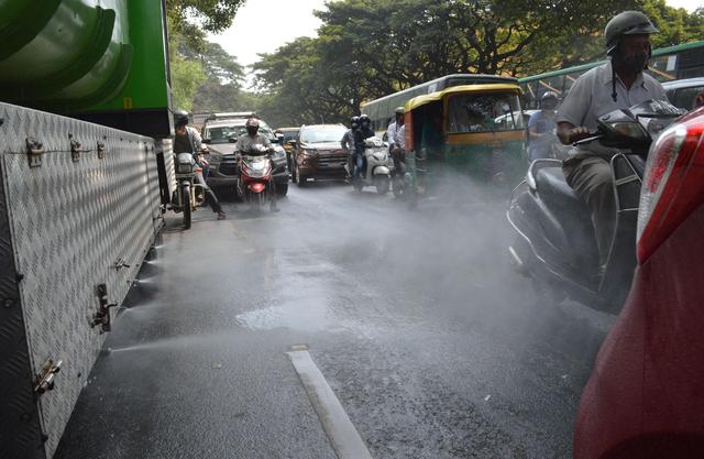 12月20日,消杀车辆在印度班加罗尔街头作业。↓
