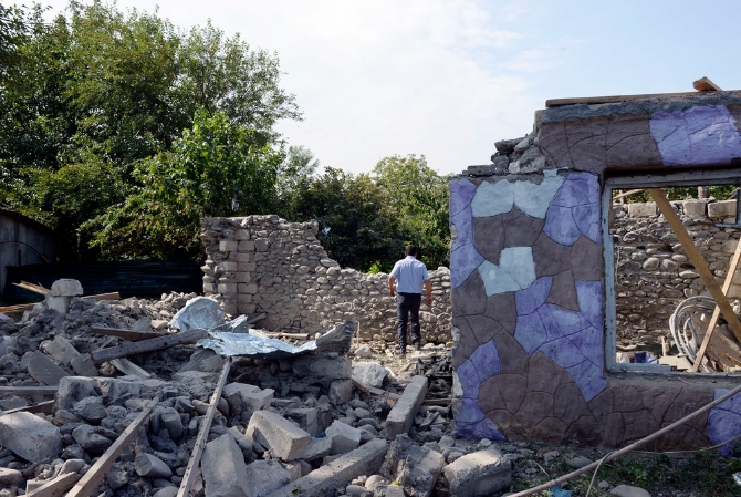 这是9月29日在阿塞拜疆临近纳卡边境的塔塔尔地区拍摄的在冲突中受损的房屋。新华社发(巴巴耶夫摄)