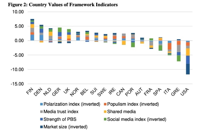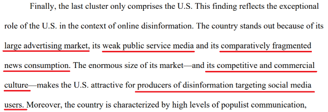 彭博社援引苏黎世大学研究者的评论称,美国人在所有标准的西方国家中,更倾向于相信“假新闻”,美国“具有轻易使得谣言与虚假信息快速传播的条件”。报告分析了导致谣言更容易传播的重要因素,一是极端对立的政治环境催生民众的撕裂;二是缺少监管的媒体环境。