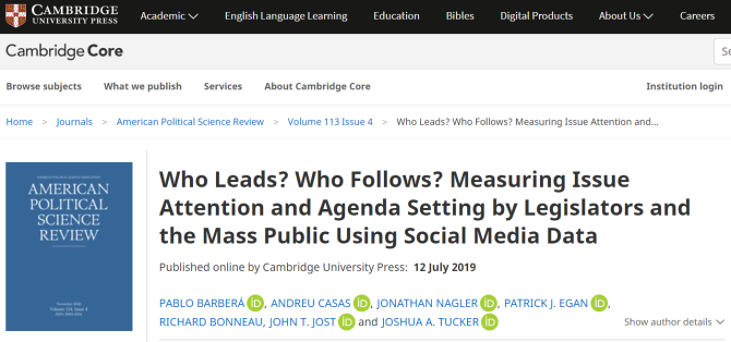 △学术期刊《美国政治学评论》2019年7月刊登的一项研究显示,政客可以通过搜集社交媒体上公众的观点、态度调整自己对相关事件的发言,并以相配套的政策手段支持该话术,从而实现“利用民意”的可能。