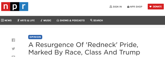 △美国国家公共广播电台在2016年9月对在当年大选中突然活跃的“红脖子”进行了报道,文章将这一群体的“回归”与种族、社会地位以及特朗普团队紧紧绑定在一起。