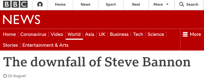 △英国广播公司(BBC)在2020年8月发表题为《史蒂夫·班农的没落》的文章,揭示史蒂夫·班农在白宫任职期间操控媒体的相关行径。