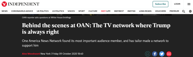 △英国《独立报》曝光“一个美国新闻”(OAN)为获得美国政府官方的媒体资源,散播大量极端、不实信息。