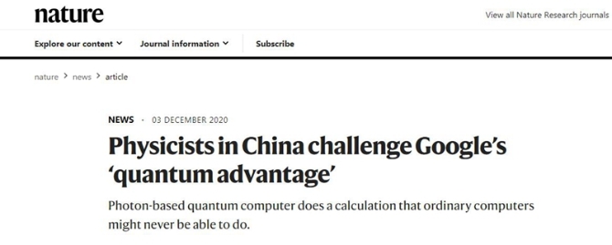 英国《自然》杂志以《中国物理学家挑战谷歌“量子优越性”》为题对这一成果进行报道。图片来源:自然杂志官网