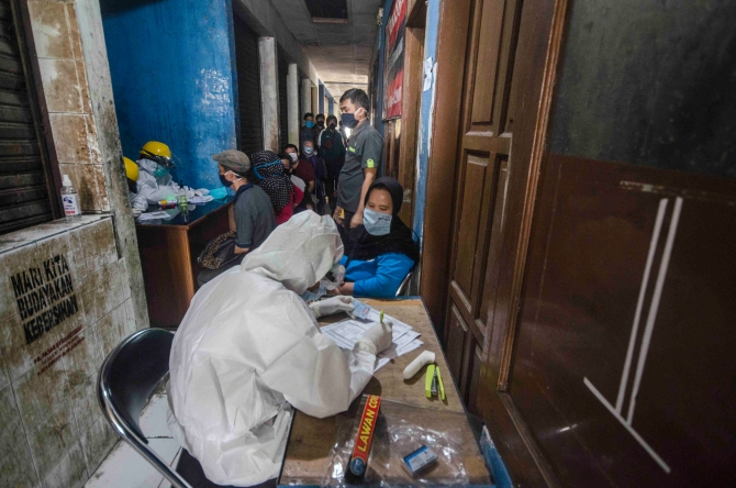 △2020年6月11日,医务人员在印度尼西亚万隆为人们做检测。