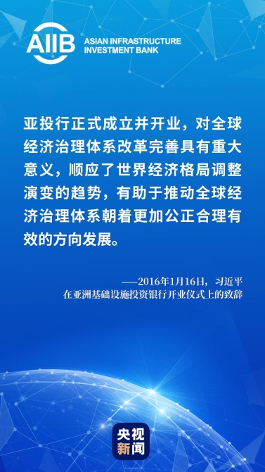 2016年1月16日,亚投行开业仪式上,习近平明确指出“亚投行是各成员国的亚投行,是促进地区和世界共同发展的亚投行”。