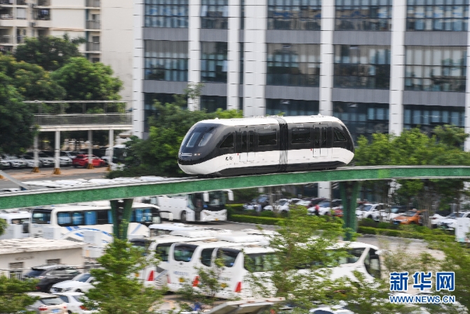 绿色太阳能路灯点亮夜空,新能源车在路上穿梭,“云轨”从头顶疾驰而过……这是在广东深圳的坪山总部内,比亚迪用技术打造的“新能源世界”。