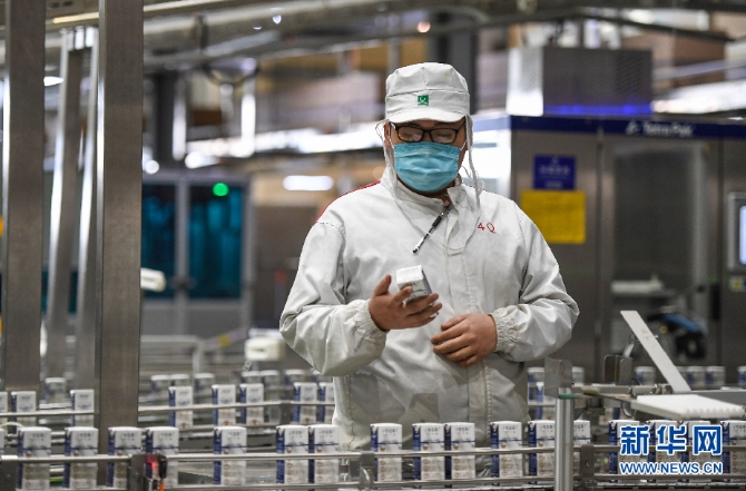 3月19日,技术人员在呼和浩特市蒙牛圣牧高科乳品有限公司的生产车间内检查产品的包装情况。新华社记者 彭源 摄