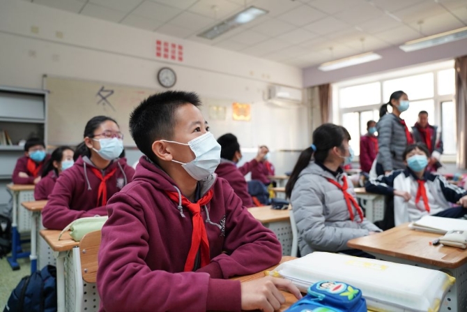 6月1日,北京小学两位返校复课的六年级学生进入学校时向老师招手示意。