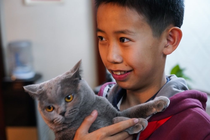 12月21日,蔡昊霖在家中与宠物猫玩耍。