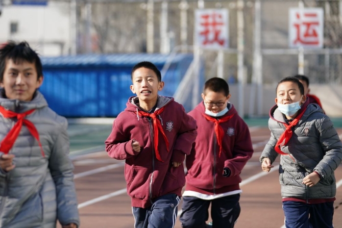 12月21日,在北京四中广外校区,蔡昊霖(左二)和同学一起上体育课。