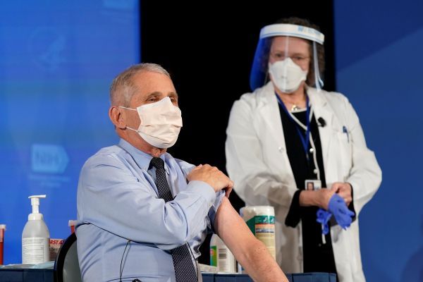福奇乐观表示,如果疫苗顺利分发,明年夏天美国就可能实现“群体免疫”。图为福奇22日接种他的第一剂新冠疫苗。(路透社)