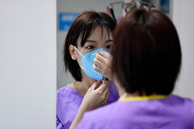 在天津医科大学总医院空港医院,张硕在戴口罩准备进入“红区”工作(12月18日摄)。