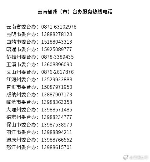 六、随时保持密切联系。云南省委、省政府十分关心在滇台湾同胞的身体健康和面临的困难,全省涉台系统将尽心竭力为广大在滇台湾同胞和台资企业提供服务。如在生产生活中遇到困难和问题,请及时与当地台办工作部门联系(联系电话附后)。