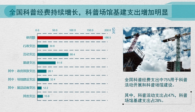 “全国科普经费持续增长,科普场馆基建支出增加明显。”全国科普数据统计负责人、科技部引智司四级调研员杨启明介绍说,全国科普经费支出中75.09%用于科普活动开展和科普场馆建设。其中,科普场馆基建支出51.64亿元。2019年全国共有科技馆和科学技术类博物馆1477个,比2018年增加16个。全国平均每94.79万人拥有一个科普场馆。