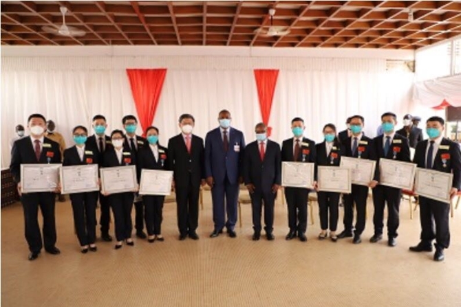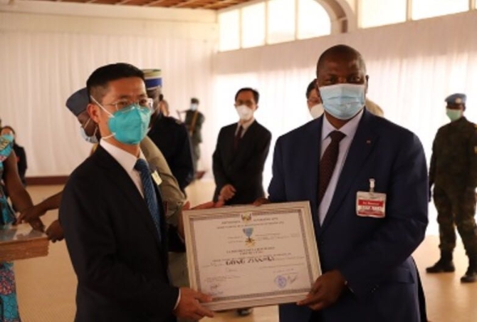 据我驻中非使馆当地时间28日消息,中非共和国总统图瓦德拉于12月26日在中非总统府亲自为即将结束使命回国的中国援中非第17批医疗队全体队员授勋。中国驻中非大使陈栋、中非卫生部长索姆塞、中国援中非第17批和第18批医疗队全体队员等出席仪式。