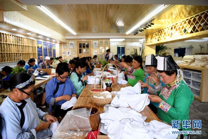 少数民族妇女在贵州省榕江县卧龙易地扶贫搬迁安置小区千匠百艺扶贫车间就业(2020年5月20日)。2020年11月23日,贵州省人民政府宣布,全省剩余9个未摘帽的贫困县全部退出贫困县序列。至此,贵州省贫困县全部出列。新华社发(王炳真 摄)