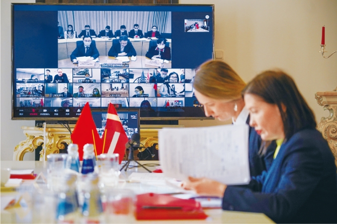 2020年3月13日,中国同中东欧17国举行新冠肺炎疫情防控专家视频会议,分享和交流疫情防控经验及信息。这是中国秉承人类命运共同体理念,为全球公共卫生安全事业作贡献的重要举措。图为在拉脱维亚首都里加,拉脱维亚卫生专家在中国驻拉使馆参加视频会议。 新华社发 亚尼斯/摄