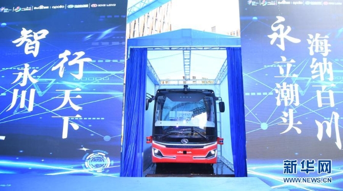 作为2020线上中国国际智能产业博览会系列活动之一,百度与金龙客车联合研发的L4级自动驾驶中巴在重庆市永川区首发(2020年9月17日摄)。新华社记者 王全超 摄