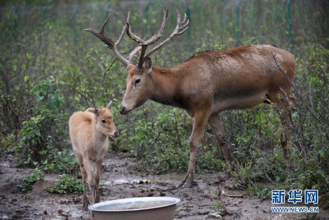 这是在湖南洞庭湖麋鹿和鸟类救护避难所拍摄的被救助的麋鹿“犇犇”(右)和一只小麋鹿(2018年5月23日摄)。新华社记者 李尕 摄