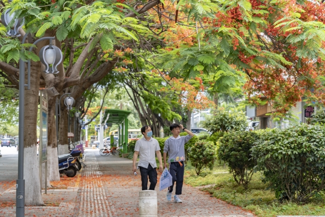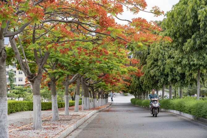 凤凰路上火红的凤凰花竞相绽放。佴斌 摄