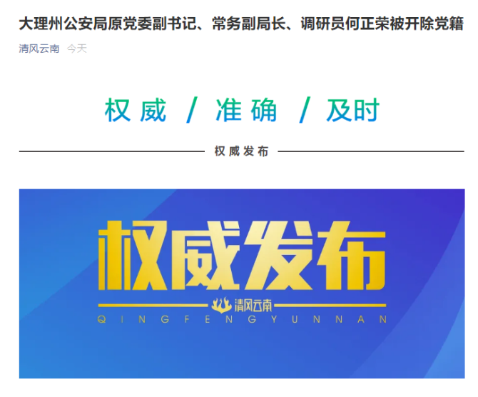 昆明信息港讯 1月5日,清风云南微信公众号发布消息,据大理州纪委监委消息:日前,经大理州委批准,大理州纪委监委对大理州公安局原党委副书记、常务副局长、调研员何正荣(已退休)严重违纪违法问题进行了立案审查调查。