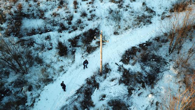 1月7日,呼中供电公司巡线检修工王殿辉和队友孙林波在执行“极寒特巡”任务的巡线途中(无人机照片)