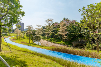 为了满足水声涌周边居民休闲运动的需求,水声涌两岸增加了城市绿地面积,河涌沿岸设置的滨水慢行步道,沿线设置景观节点供游人休憩游玩。如在金融街滨水广场设置了一座七彩广场,并在广场上喷设图案,增强广场趣味性。另外,还在广场处设置海绵城市科普玻璃,以及雨水花园处设置科普牌,向居民科普海绵城市、雨水花园等相关知识。