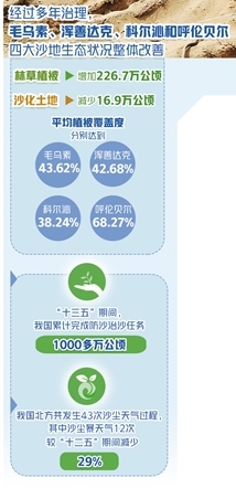 向沙漠宣战是我们要打且必须打赢的一场硬仗。国家林业和草原局公布的一组数据显示,“十三五”期间,我国荒漠化防治成效显著,全国累计完成防沙治沙任务1000多万公顷。毛乌素、浑善达克、科尔沁和呼伦贝尔四大沙地生态状况整体改善,林草植被增加226.7万公顷,沙化土地减少16.9万公顷。