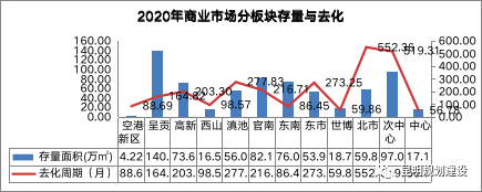 2020年办公市场官南、呈贡和东南板块供应量最多,呈贡、高新、官南板块成交量较高,呈贡、东南和官南板块存量面积最大,世博板块去化周期最长。