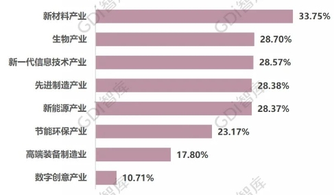在本次上榜企业中,专利授权率居前三位的产业为新材料产业、生物产业和新一代信息技术产业,专业授权率依次为33.75%、28.70%和28.57%。数据显示,节能环保产业、高端装备制造业和数字创意产业专业授权率较低。