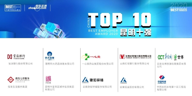 富滇银行股份有限公司、俊发生活服务集团、昆明积大药品销售有限公司、昆明市呈贡区城市投资集团有限公司、一心堂药业集团股份有限公司、云南驰宏锌锗股份有限公司、云南红塔银行股份有限公司、云南铝业股份有限公司、云南世博旅游控股集团有限公司、中国水利水电第十四工程局有限公司等十家单位,成为昆明地区十佳雇主。