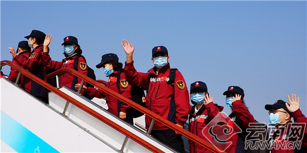 4月8日,中国政府赴缅甸抗疫医疗专家组出征仪式在昆明长水机场举行。记者 龙彦 夏方海 摄