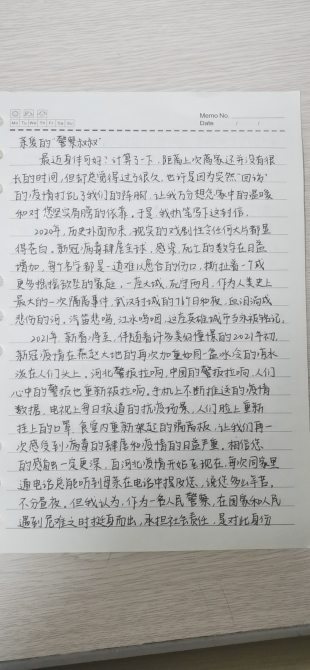 张佳琪说,从小到大,父亲陪她们的时间不多,即便回家也是电话不停,自己也因为爸爸是一名光荣的人民警察而感到骄傲,所以自己就叫他“警察叔叔”,这样觉得挺亲切的,又挺自豪的。因为疫情,爸爸这段时间工作特别忙,找不到时间去跟他聊天,所以就给爸爸写了封信,说说我心里话,给他加油打打气。“小时候听他说得最多话就是晚上要加班工作,没有办法回家陪我们,不过我也不太怪他,因为我知道他在保护我们,保护国家,我很支持他。他在我心目中是最棒的父亲,最伟大的英雄。我们一定会在不久之后团聚。”