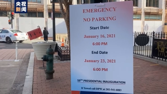路口张贴的告示显示,总统就职典礼相关区域的道路从当地时间16日晚开始,一直到23日晚禁止停车,很多路口直接设置了密集的水泥路障。