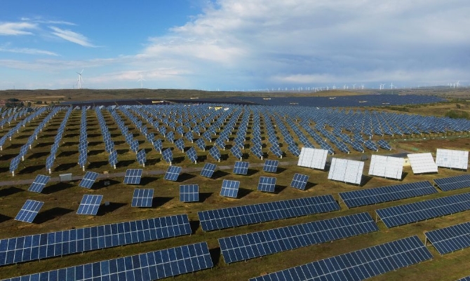 张家口市张北县大河乡国家风光储输示范基地的光伏发电站和风电场遥相呼应(9月15日无人机拍摄)。新华社记者杨世尧摄