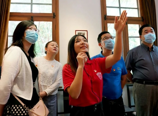 2018年5月,复旦大学将陈望道故居改造为《共产党宣言》展示馆,该校一批青年教师和学生组建党员志愿服务队,面向广大师生和社会各界开展宣讲活动。2020年6月,习近平总书记给党员志愿服务队全体队员回信,勉励他们继续讲好关于理想信念的故事。图为志愿服务队队员(中)在为观众讲解。新华社记者 刘颖/摄