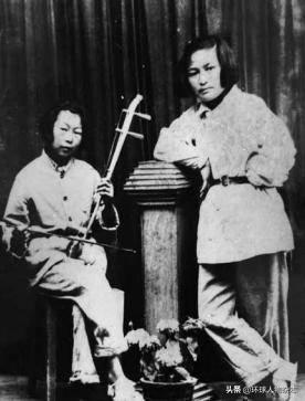·1945年参军前,身着粗布衣和草鞋,会拉胡琴的舒炜(左)在延安。