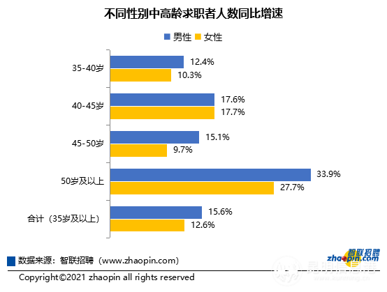 智联招聘近日发布《中高龄求职者就业问题研究报告》,其中指出,我国就业市场在新冠肺炎疫情冲击下保持平稳,但不同年龄的劳动力群体间出现结构性分化,更多中高龄求职者进入再就业市场,35岁及以上求职者同比增长14.9%,低学历中高龄人群面临的再就业压力更大,男性中高龄人群再就业压力大于女性。