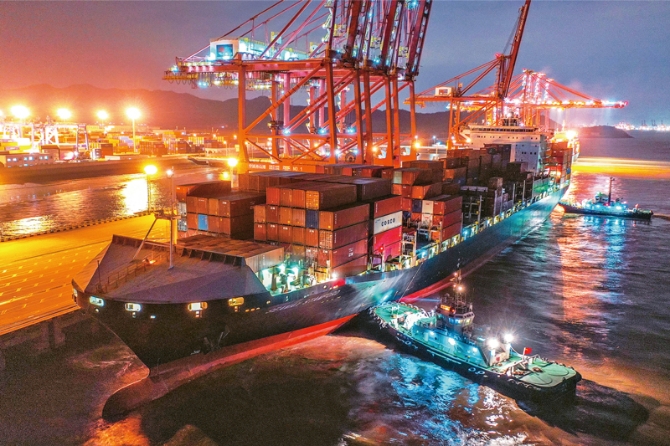 开放带来进步,封闭必然落后。面对世界风云变幻,我国坚定扩大对外开放,放宽市场准入,持续优化营商环境,开放的大门越开越大,为我国经济发展和世界经济恢复注入了强大动力。图为2020年12月15日晚,一艘集装箱船缓缓靠上宁波舟山港金塘港区大浦口集装箱码头,这是大浦口码头新增航线——以星西非线的首航船。 人民图片 姚峰/摄