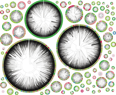 始于单个癌细胞的系统发育树。每种颜色代表体内的不同位置,五颜六色的树显示出高度转移的表型。