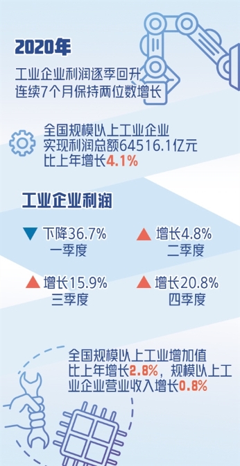 “2020年,全国规模以上工业增加值比上年增长2.8%,规模以上工业企业营业收入增长0.8%。生产和销售稳定恢复,为利润增长提供了有力支撑。”国家统计局工业司高级统计师朱虹表示,分季度看,企业利润呈现“由负转正、逐季加快”的走势。受疫情严重冲击影响,一季度利润同比大幅下降36.7%,随着“六稳”“六保”任务不断落实落细,企业复工复产水平稳步提升,二季度利润增长4.8%,三季度增速回升至15.9%,四季度进一步加速至20.8%。12月份,规模以上工业企业利润同比增长20.1%,增速比11月加快4.6个百分点,继5月份实现月度增速由负转正后,连续7个月保持两位数增长。