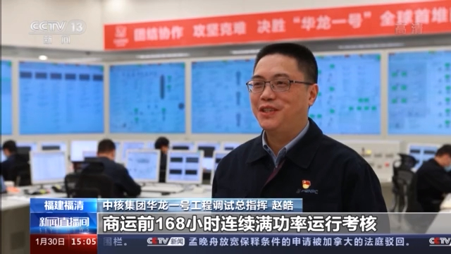 中核集团“华龙一号”工程调试总指挥 赵皓:商运前168小时连续满功率运行考核,是新建核电机组移交生产前的最后一项工作,验证机组按照设计技术要求在满功率工况下安全可靠、连续运行的能力。