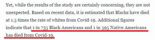 美国公共媒体研究实验室近日发布的数据显示,原住民和非洲裔美国人在新冠肺炎疫情中病亡率最高,平均每595名原住民和每735名非洲裔美国人中就有1人死于新冠肺炎,而美国白人的病亡率是平均每1030人中病亡1人。