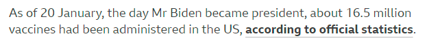 英国广播公司(BBC)的数据显示,截至1月20日,美国只接种了大约1650万剂新冠疫苗。