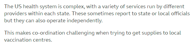 BBC的报道说,美国的医疗系统很复杂,各州的不同供应商还可提供各种不同的服务,这让美国疫苗接种的协调工作充满挑战。