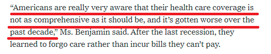 《纽时时报》的报道说,新冠肺炎疫情导致失业人数“惊人”,更多人负担不起医疗保险。纽约社区服务协会副会长伊丽莎白·本杰明表示,“美国人非常清楚,他们的医疗保险没有达到应有的全面程度,而且在过去十年里,情况变得更糟了”。