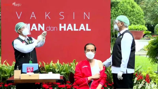 当地时间1月13日,印度尼西亚总统佐科在总统府接种了中国科兴生物制药公司的新冠疫苗,并在网络直播中展示了自己接种疫苗的过程。