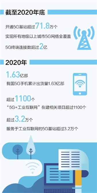 工信部1月26日发布的最新统计数据显示:我国已建成全球最大5G网络,截至2020年底,开通5G基站超过71.8万个,实现所有地级以上城市5G网络全覆盖,5G终端连接数超过2亿。